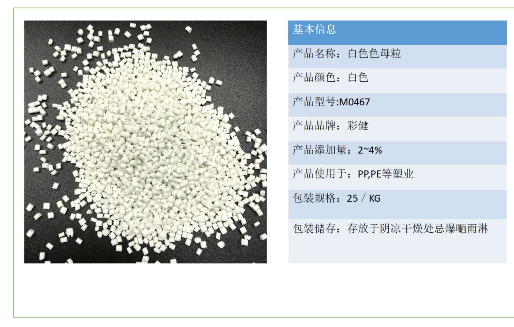 彩健生產(chǎn)的白色母廣泛應(yīng)用于塑料加工行業(yè),PP、PE、PVC、ABS、PS、475、PC、EVA等適用于大部分熱塑性樹脂。